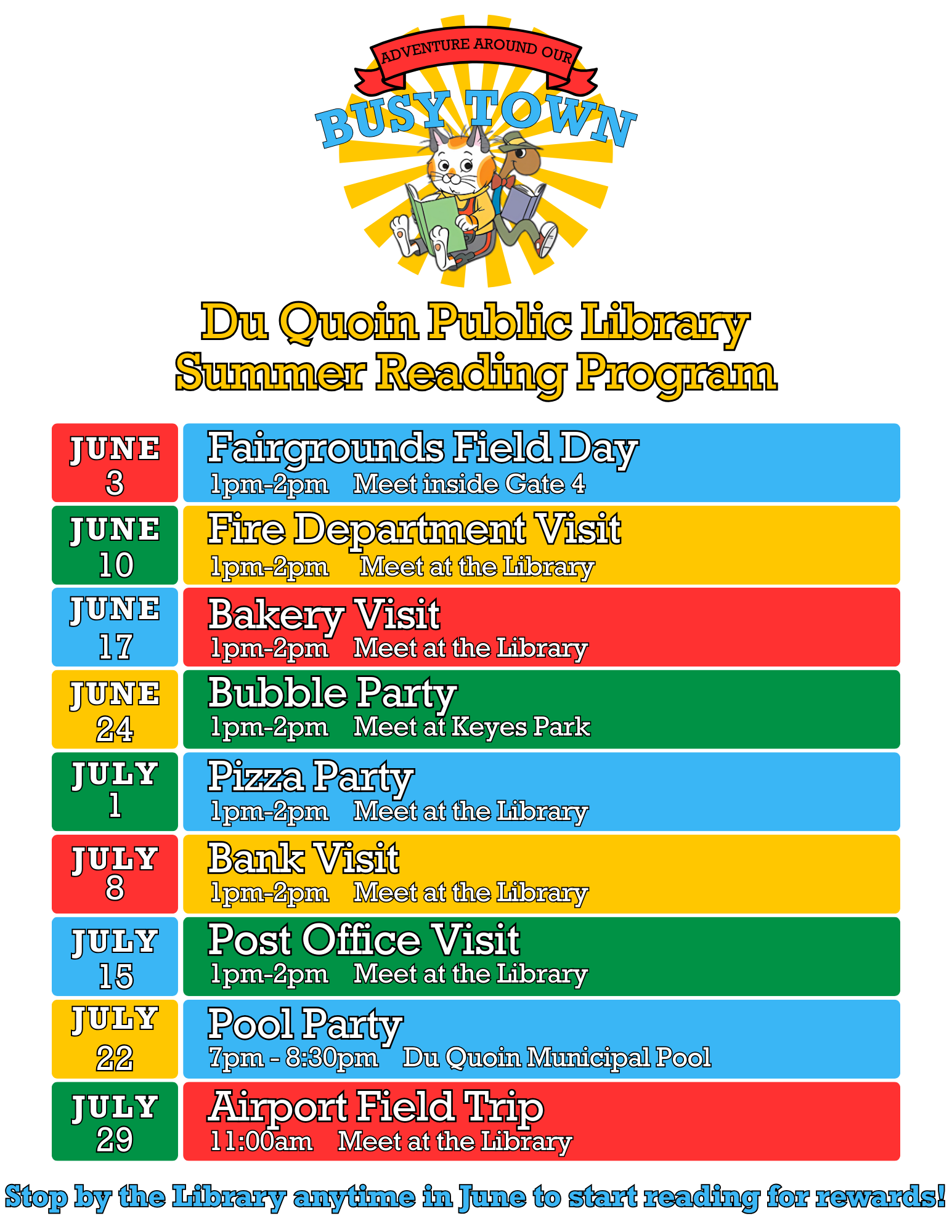 The Summer Reading Program at the Du Quoin Public Library is an annual event designed to encourage everyone in the community, from toddlers to adults, to read and engage in fun activities throughout the summer. Each year features a unique theme, providing new adventures and exciting opportunities to earn prizes and participate in special events!